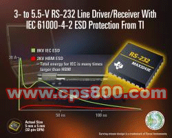 TI符合Level 4標準(±8kV 接觸放電以及±15kV氣隙放電)的MAX3243E與MAX3232E以及執行高于Level 3規范(±6kV 接觸放電與±8kV氣隙放電)的MAX3227 可滿足低功耗、高速應用的需求,如便攜式/消費類設備、電信以及計算應用等領域。由于能夠在斷電模式下實現超低功耗(典型ICC 1uA)、高數據速率(高達1Mbps)以及5.5V耐壓輸入,這些器件能夠滿足大多數RS-232通信的需求。