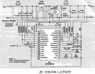 TPS56100是一款開(kāi)關(guān)模式的同步降壓電源控制器,能提供精確的可編程電壓輸出,適合5V單電源供電的微處理器應(yīng)用。1.3V~2.6V的參考電壓來(lái)源于可編程電壓引腳(VP)。通過(guò)VP引腳可將輸出電壓設(shè)置成等同于參考電壓,或者通過(guò)采樣電阻(R2,R3)(見(jiàn)圖1)將輸出電壓設(shè)置成參考電壓的倍數(shù)。TSP56100還具有一個(gè)輸入禁止引腳來(lái)控制上電順序和低電壓禁止,從而保證在啟動(dòng)控制器之前,電源輸出沒(méi)有偏差。