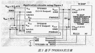 作為一個(gè)同步降壓開(kāi)關(guān)模式的電源控制器件,TPS56XX應(yīng)用在需要雙電壓輸出和寬電壓輸入范圍的直流負(fù)載應(yīng)用中(如多組DSP應(yīng)用)。采用TPS56xx的同步降壓轉(zhuǎn)換器具有固定輸出電壓(3.3V、2.5V、1.8V和1.5V),可為有負(fù)載瞬態(tài)響應(yīng)要求的DSP、高速存儲(chǔ)器和類(lèi)似的處理器提供性能卓越的電源解決方案。