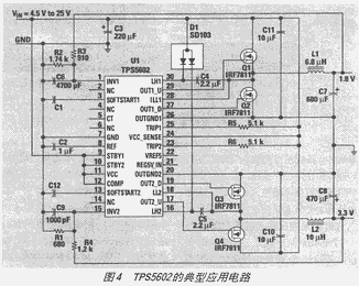 圖4是采用TPS5602的典型應(yīng)用電路。該電路包括一個(gè)輸出電壓為1.8V和3.3V的雙通道同步降壓轉(zhuǎn)換器。兩個(gè)輸出電壓不僅互不依賴(lài),而且可通過(guò)取樣電阻(如R1、R2、R3和R4)調(diào)整它們的輸出范圍(大約在輸入電壓和1.2V之間)。輸出電壓OUT1和OUT2的方程式如下,其中參考電壓為1.185V。