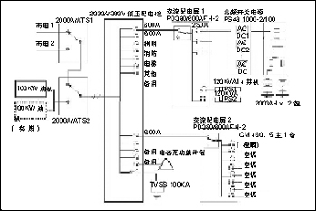 如圖所示,這是一個典型的5萬門以上的一類局站供電方案原理圖。整個動力系統初期由兩路市電、一路油機輸入(終期可擴展為兩臺油機),經過高性能的ATS自動切換開關選擇一路供電輸入低壓配電柜,低壓配電母線上加裝了TVSS抗浪涌裝置和無功補償柜。電能由低壓配電柜分配給下一級的交流配電屏以及電梯、消防、水泵和照明等其它用電。給通信設備供電的直流不間斷電源和交流不間斷電源有專用的交流配電柜,直流電源采用N+1備份的智能高頻開關電源系統,交流部分采用兩臺UPS 1+1直接并聯的冗余方式,對于一類重要的局站,電池也建議采用1+1備份的方式。通信機房和電力(電池)室的空調也應采用恒溫、恒濕的機房專用精密空調,為設備的可靠運行提供良好的環境保障。