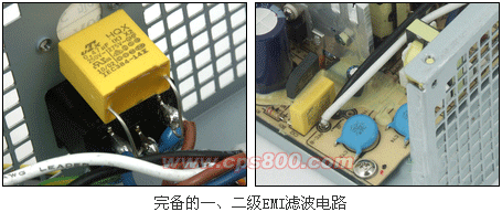 網吧精靈(ATX3500-L)設計了完備的一、二級EMI濾波電路。完備的EMI濾波電路可有效的濾除電網中的高頻雜波和同相干擾信號,能有效避免電源中產生的電磁輻射泄漏。沒有EMI電路的電源會泄漏大量的電磁輻射,不但會影響到顯示器和聲卡等設備的正常使用,而且還會對人身造成傷害。