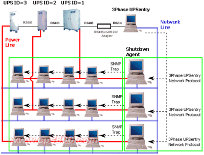 以往的配線方式是將每部UPS到UPS間以RS485或RS422串聯,但當距離拉遠時不僅消耗線材也使得通訊上易受干擾。現今大部份廠區網絡線漸廣,善用既有的網絡線就近將UPS透過網絡與監控系統聯機不但可節省配線開銷也能提高通訊品質。