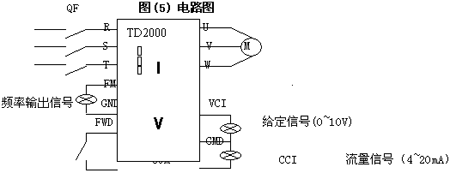 流量設定信號為0~10V,接變頻器VCI—GND端子;流量反饋信號為4~20mA(跳線CN10跳在I側),接變頻器CCI—GND端子,變頻器采用端子FWD—COM控制啟/停。變頻器的頻率信號由FM-GND端子輸出,如圖(5)所示: