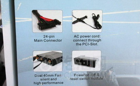 在接口上這款電源提供了24pin接口、6pin接口(PCI Express專用接口)、2個SATA接口。電源的尾部有兩個40mm的風扇散熱。