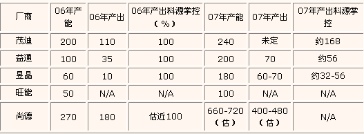 2006、2007年兩岸主要太陽(yáng)能電池廠產(chǎn)能及料源動(dòng)態(tài)