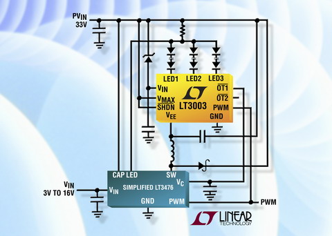 LT3003 的 LED 鎮流設計優于用外部鎮流電阻實現 3 個獨立通道的常規方法,而外部鎮流電阻需要昂貴的工廠校準工作。就輸入電源可變化為高于和低于 LED 串輸出電壓的應用而言,LT3003 允許 LED 輸出電壓返回到輸入電源值(降壓-升壓模式),而不限于僅有 SEPIC 解決方案。LT3003 非常適合用在采用凌力爾特公司 LT1618、LT3474、LT3475、LT3476、LT3477 和 LTC3783 LED 驅動器的設計中。
