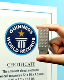 東芝公司近日宣布,東芝開發的超小型燃料電池已經申請吉尼斯世界記錄,今年9月發行的2006年版吉尼斯世界記錄將刊載東芝超小型燃料電池。