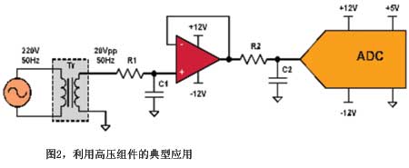 電壓與電流測量較常見的解決方案之一就是使用高壓組件。來自變壓器或變流器的信號經濾波后可通過運算放大器加以緩沖,變壓器與運算放大器之間的必須有一個電阻、電容(RC)濾波器,用以限制電壓尖峰與輸入電流,圖2示出了采用這一配置的典型應用電路。
