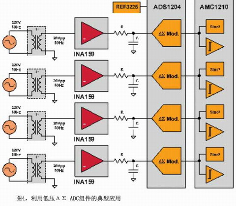 第三種可選解決方案是使用ΔΣ ADC來轉換輸入信號。使用ΔΣ ADC轉換器進行測量的主要優勢之一是可以使用數字濾波器。數字濾波器不僅能夠濾除轉換器的量化噪聲,而且還能以固有的方式對此類應用中存在的較大噪聲定形,并將其排除在信號頻帶之外。在某些測量中除采用前面提到的6通道外還增加了另外兩個通道。在這些情況下,也可以測量零線(neutral line)電壓與電流。ΔΣ轉換器(例如TI公司的ADS1204)具有四個16位性能獨立的ΔΣ調制器。通過使用兩個ADS1204轉換器,可以同時從8個輸入通道獲得測量數據。