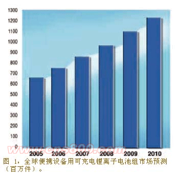 便攜式設備可充電電池組(鋰離子、鋰聚合物、鎳金屬氫化物、鎳鎘)的全球市場有望在 2005 年達到 11 億件的規模。大部分銷售將是針對手機及其變體產品。居主導地位的化學電池是鋰離子電池,有望從 2005 年的 6.64 億件增長至 2010 年的 12 億件,復合年均增長率 (CAGR) 為 13.0%。