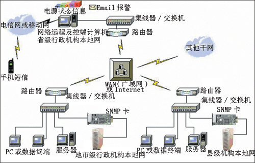 對于地市級政府行政機構和縣級行政機構本地網UPS電源,同樣可通過SNMP卡或RS232接口接入本地網內,在本地后臺監控的同時,也可通過接入WAN,從而組成全省范圍的UPS電源監控系統。如果該省某政府機構擁有全省獨立的傳輸交換系統,則可直接將各地UPS系統通過RS232接口接入本地傳輸RS232口,通過傳輸系統提供的透明傳輸通道將各地UPS監控系統接入到省廳機關的中心機房進行全省級電源集中監控。