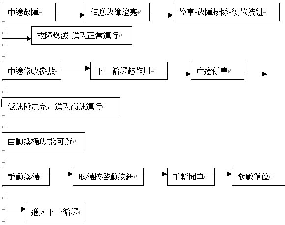 滿桶后,圈條盤出口自動定位,主機停車,依次換桶電機啟動帶動弧形推桶板推出滿桶、斷條、推桶板退回;轉臂電機啟動使轉臂向下旋轉90°;推動電機再啟動,通過轉臂將滿桶繼續外推;補桶電機通過傳動由撥盤將空桶送至預定位置,撥盤退回;推動電機經轉臂將空桶拉到底盤上;轉臂電機使轉臂上旋90°,最后主電機啟動。完成全部換桶過程只需30多秒。該過程由PLC控制,保證了換桶的可靠性。