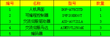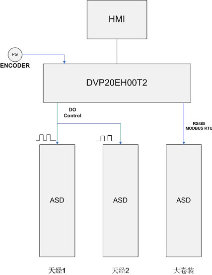 三經軸部分主要采用DELTA A型7.5人機界面、EH型20點可編程控制器(晶體管輸出)、三臺0.75KW A型交流伺服驅動器、一個360線增量型編碼器組成!其中以可編程控制器為CPU;以人機界面為參數設定接口界面;采用MODBUS協議對大卷裝通訊控制;對兩天經采用高速脈沖控制!具體系統構成如下: