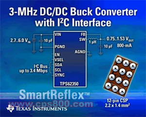 配合SmartReflex電源與高性能技術(shù),TPS62350針對目前的智能電話進行了優(yōu)化。SmartReflex解決方案充分采用TI深亞微米工藝技術(shù),因而顯著降低了芯片級漏電功耗。該技術(shù)集成了各種智能與自適應軟硬件技術(shù),可根據(jù)設備的工作情況、工作模式以及工藝與溫度變化對電壓、頻率及功耗進行動態(tài)控制。