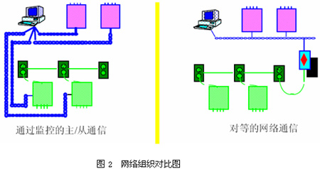 雖然組建控制網(wǎng)絡(luò)的方法有很多,但是對(duì)于自動(dòng)化控制而言,平坦的、對(duì)等式(P2P)體系結(jié)構(gòu)是最好的。P2P體系結(jié)構(gòu)和其它任何一種分級(jí)的體系結(jié)構(gòu)相比,不再具有分級(jí)體系結(jié)構(gòu)與生俱來的單點(diǎn)故障。在傳統(tǒng)的體系結(jié)構(gòu)中,來自某一個(gè)設(shè)備的信息要傳遞給目標(biāo)設(shè)備,必須先傳送到中央設(shè)備或者網(wǎng)關(guān)。因此,每兩個(gè)非中央設(shè)備之間的通信包括了一個(gè)額外的步驟,或者說增加了故障的可能性。P2P體系結(jié)構(gòu)的設(shè)計(jì)相比之下,它允許兩個(gè)設(shè)備之間直接通信,這避免了中央控制器的故障可能性,并且排除了瓶頸效應(yīng)。此外,在P2P設(shè)計(jì)中,設(shè)備的故障更多的可能是只影響到一個(gè)設(shè)備,而不象非平坦的、非對(duì)等式體系結(jié)構(gòu)中潛在的影響到許多設(shè)備。由圖2 可以看出通過監(jiān)控的傳統(tǒng)的主從通訊網(wǎng)絡(luò)與P2P體系通訊網(wǎng)絡(luò)的優(yōu)劣。