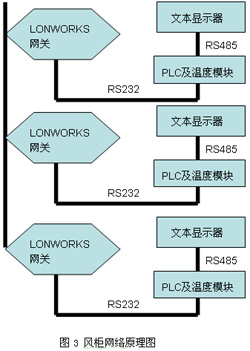 由圖3,現(xiàn)場(chǎng)的監(jiān)控由文本顯示器TP04G來實(shí)現(xiàn),遠(yuǎn)端的監(jiān)控通過LONWORKS網(wǎng)關(guān)節(jié)點(diǎn)來實(shí)現(xiàn)。這樣組成一個(gè)分布式智能控制系統(tǒng)。遠(yuǎn)端的上位計(jì)算機(jī)通過與末端的LON網(wǎng)關(guān)交換數(shù)據(jù),網(wǎng)關(guān)節(jié)點(diǎn)根據(jù)從信道中接受到的數(shù)據(jù)包判斷是否是合適本網(wǎng)關(guān)的數(shù)據(jù)包,如是,則網(wǎng)關(guān)節(jié)點(diǎn)應(yīng)用程序再將數(shù)據(jù)下達(dá)至PLC,完成遠(yuǎn)端的監(jiān)控。