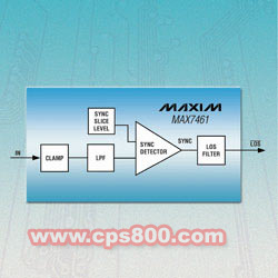 MAX7461可以輸入交流耦合的復(fù)合視頻信號(hào)(CVBS)、亮度信號(hào)(Y)、綠同步信號(hào)(SoG),當(dāng)檢測(cè)到輸入端無視頻同步信號(hào)時(shí),芯片拉低漏極開路輸出/LOS,產(chǎn)生一個(gè)報(bào)警。這種方法可以省去微控制器,不像典型的競(jìng)爭(zhēng)方案那樣,需要采用微控制器來檢測(cè)視頻同步信號(hào)。MAX7461通過內(nèi)部濾波器衰減色同步信號(hào)、色度信號(hào)和系統(tǒng)噪聲來防止檢測(cè)到假同步信號(hào),可檢測(cè)的同步信號(hào)可以低至0.13VP-P值。