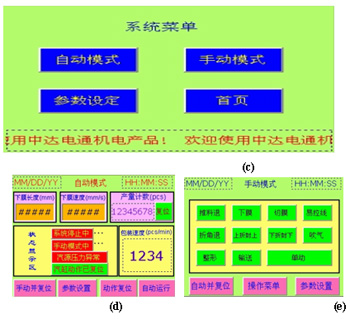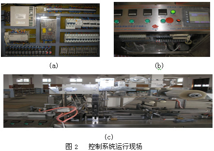 LS-300L型包裝機所有機構全部采用氣動組件,全部采用氣動控制,在同行業同類型產品中屬于中高檔機種。該包裝機對于各種形狀、大小的包裝盒都能包裝塑料膜,只需通過控制系統的人機界面對輸送軌道的寬度、包裝膜的長寬、折角整形的寬度等進行調整就能夠進行包裝。系統主要采用臺達工控產品DOP-A57CSTD,DVP-32EH00T,ASD-A0421LA,ASMT04L250AK,DTA4848等構成系統,包裝機控制系統運行現場如圖2(a)、圖2(b)和圖2(c)所示。