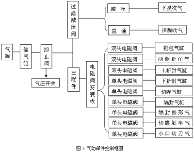 控制系統的控制有3種工作方式:1)手動操作;2)單動操作;3)自動連續操作。氣動部件控制框圖如圖3 所示。以下對控制系統手動操作方式考慮作簡要說明,單動操作和自動連續操作與手動操作方式類似,不再多敘。