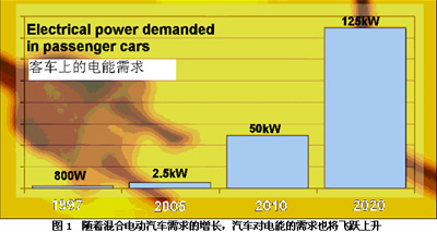 直到十多年前,汽車上的大多數電氣負載都是由如排風扇、娛樂系統、燈光等汽車輔件構成。近年來電氣負載已經包括如防鎖制動、多計算機系統、多功能顯示系統、HID燈光系統以及電子打火等負載。但是,為了代替機械連接(例如動力方向盤)或提高低速時內燃機的效率,在汽車設計中已經引入了重要的電氣馬達,這對于新一代汽車來說它的電能需求將出現量的飛躍。目前全球市場對混合電動汽車的需求有一個強勁的增長,因為這種汽車能夠將電機的輸出和內燃機的輸出結合起來以提高燃料的使用效率。如果我們用超前的眼光來看待混合電動汽車以及將來完全依靠電能運行的氫燃料電池汽車,很明顯汽車對電源的需求將會持續增長。