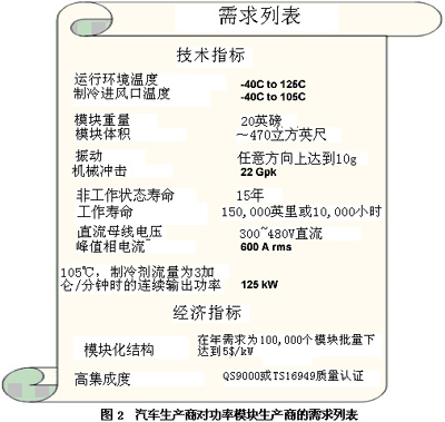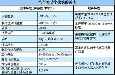 汽車對功率模塊的需求可大致劃分為兩大類——技術需求和經濟性需求。技術性指標指功率模塊滿足汽車在電氣性能、環境限制、體積以及重量方面的要求。而混合電動汽車對功率模塊最重要以及最賦挑戰性的一個技術指標就是在不降低模塊性能或縮減模塊壽命的情況下讓其在冷卻進風口溫度為105ºC的情況下正常運行。因此,如果能擴大模塊運行的溫度范圍(-40ºC至125ºC),就會減輕設計者為模塊提供單獨制冷回路的負擔。