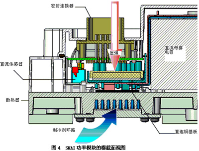 SKAI功率模塊的核心部分是六個IGBT構成的功率單元,它由三個半橋焊接到氮化鋁陶瓷基板(DBC)上組成。每個DBC上面有十二個600V NPT或1200V 溝槽IGBT、六個匹配的二極管、門極電阻以及一個正溫度系數的熱敏電阻構成。從每個DBC的交流和直流母排結構之間可以看出它有很高的集成度?偩結構(交流和直流母排)和DBC使用賽米控的SKiiP®技術在超過2,100 lbs/Inch2的壓強下壓接起來的,這是一項獨特的受專利保護的壓接技術。壓接系統消除了在DBC和模塊基板之間常見的大面積的焊接界面,這便提高了連接的可靠性。因此SKAI模塊就循環負載測試性能而言比使用基板的傳統功率模塊的性能要優越十倍。氮化鋁基板的使用也提高了系統的可靠性。研究表明使用氮化鋁模塊的壽命要比使用便宜的氧化鋁(Al2O3)的模塊的壽命提高兩倍。通過使用彈簧將門極、傳感器在DBC和驅動/控制板之間連接了起來,因而減少了功率模塊中連線的使用數目。鍍銀彈簧也被證明是功率模塊中小電流控制和傳感器信號傳遞的一種可靠的方法。