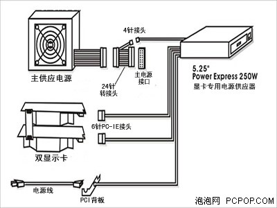 產品提供的所有附件包括了:電源線、24針轉接頭、兩個線卡、一包四顆手擰螺絲還有一個詳盡的使用說明書。那么電源主體是怎么和這些附件實現連接安裝的呢?請看下面的Power Express安裝回路圖: