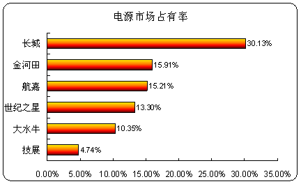 世紀之星是老牌電源品牌,其產品的主要特點是價格比較低廉,電源用料優秀,此次調查中獲得13.30的市場占有率,成績比2004年有接近2個百分點的提升。大水牛的產品也面向中低端消費者,產品線較為豐富,而且不乏高性價比產品,獲得了10.35%的市場占有率。
