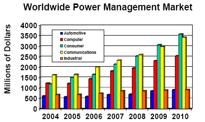 根據DATABEANS估計數據,從2004年至2010年每年電源銷售額以15%幅度增長(見圖1)。到2010年整個全球電源管理市場將存近120億美元的銷售額。應注意,電源在模擬器件市場份額大約占到40%~50%。