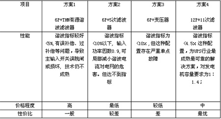 方案2. 采用6脈沖UPS+5次諧波濾波器,如果UPS整流裝置為三相全控橋6脈整流器,由整流裝置產生的諧波占所有諧波的近25-33%加5次諧波濾波器后減小到10%以下, 輸入功率因數0.9,可局部減小諧波電流對電網的危害。這種配置,輸入電流諧波仍然偏大,對發電機容量配比要求為1:2以上,并存在導致發電機輸出異常升高的隱患;