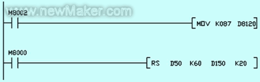 PLCRS232串口通信可使用無協議(RS指令)或專用協議與上位機進行通信,本例中使用無協議與上位機進行通信,如圖四所示:D8120用于設定PLC通信格式,D50表示發送起始地址,K60表示發送字節數量,D150表示接收起始地址,K20表示接收字節數量。