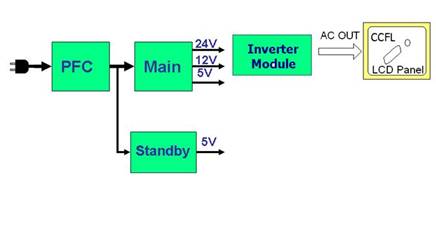 大尺寸LCD TV/MONITOR電源功率大部分為背光源所消耗。下圖為昂寶電子設計的LCD電源解決方案框圖。