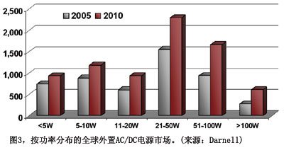 如圖3所示,全球外部電源市場中高功率和低功率部分增長的幅度不同,部分原因是低功率部分面臨的諸多威脅;現在更重要的是許多快速增長的應用來自于更高功率部分。這一增長主要是北美和歐洲對筆記本電腦和大屏幕平板顯示器拉動。筆記本電腦作為桌面電腦替代品的趨勢使電源適配器越過100W大關,比傳統的60W大關高很多。平板顯示器隨著顯示屏幕面積的增加而增大超過50W。
