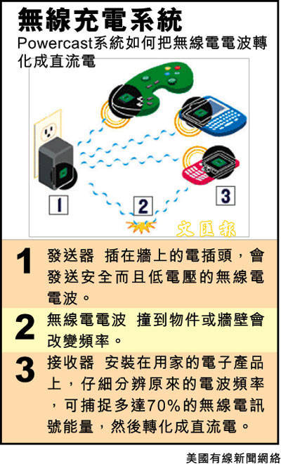 據(jù)香港《文匯報(bào)》報(bào)道,無線充電系統(tǒng)由Powercast公司開發(fā),聲稱整個(gè)系統(tǒng)絕不比一部收音機(jī)復(fù)雜,而且造價(jià)低廉,基本接收裝置成本只需5美元。具體裝置只需一個(gè)安裝在墻身插頭的發(fā)送器,以及可以安裝在任何低電壓產(chǎn)品的“蚊型“接收器,它會(huì)把無線電波轉(zhuǎn)化成直流電,可在約1米范圍內(nèi)為不同電子裝置的電池充電。