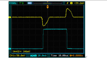 負載瞬變時間是一項動態(tài)時間,它是負載電流瞬變后開關電源的輸出電壓穩(wěn)定到預先規(guī)定穩(wěn)定帶內的時間。測量信號的過程中,示波器必須有足夠的采樣率和波形捕獲率才能有效的捕獲到需要的波形。我們通常所測的響應為µs或ms量級,而RIGOL的DS1302CA可以測量最小1.2ns的上升時間,完全可以捕獲該瞬變信號。圖2反映了電流由0.1mA到65mA的過程中電壓瞬態(tài)變化情況。