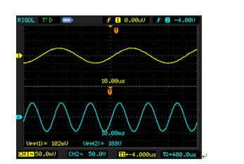 在開關電源測試中經常同時測量電路的輸入和輸出端,但輸入和輸出電壓的差距較大給操作帶來了一定難度。DS1302A的交替觸發(fā)能夠同時測量分析輸入和輸出兩個信號,解決了操作上的難題。以往在中端示波器中,雙通道同時顯示時都是時基共用,而現(xiàn)在的產品就可用交替觸發(fā)來實現(xiàn)兩個通道各自有自己的時基,并且在各通道上可以選取不同的觸發(fā)方式。如圖5示,兩個不同的信號,一個是Vpp=188V的信號,另一個是Vpp=102mV的信號,它們的頻率分別為50Hz和20kHz。