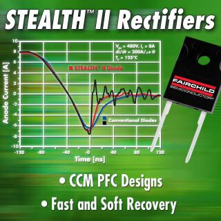 這些STEALTH II整流器具有快速反向恢復和軟恢復特性,能夠在CCM(連續電流模式) PFC設計中降低MOSFET開關損耗和EMI。雖然其它解決方案也可能具有很快的反向恢復功能,但卻要付出EMI性能降低的代價。飛兆半導體的STEALTH II整流器具有很低的存儲電荷及軟恢復能力,可把功率開關電路中的振蕩和電氣噪聲降至最小,從而降低總體EMI。使用飛兆半導體的STEALTH II整流器,設計人員無需采用緩沖電路,并且能夠減小EMI濾波器的尺寸,使得整個解決方案更加有效、緊湊及成本更低。