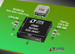 凌力爾特公司(Linear Technology Corporation)推出 DC/DC 微型模塊 (uModuleTM) 穩(wěn)壓器系列的最新器件 LTM4607,該器件在可變輸入電壓高于、等于或低于輸出電壓時調節(jié)輸出電壓。LTM4607 為電壓較高的系統(tǒng)而設計,在 4.5VIN 至 36VIN 范圍內工作,調節(jié) 0.8V 至 24V 的輸出電壓,提供高達 190W 的輸出功率。LTM4607 在 15mm x 15mm x 2.8mm 焊盤網(wǎng)格陣列 (LGA) 塑料模制封裝中集成了一個同步降壓-升壓型 DC/DC 控制器、4 個 N 溝道 MOSFET、輸入和輸出旁路電容器以及全補償電路。要實現(xiàn)一個非常扁平、緊湊和高效率的設計,僅需要一個電感器、反饋和檢測電阻以及大容量電容器。LTM4607 為網(wǎng)絡、工業(yè)、汽車系統(tǒng)和大功率電池供電設備等應用提供了緊湊的穩(wěn)壓器解決方案。