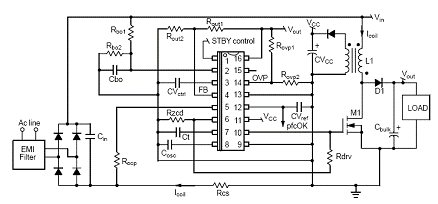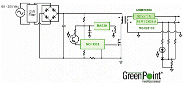 這個參考設計的關鍵器件是NCP1351,這是一款針對低功耗離線反激開關電源(SMPS)設計的電流模式控制器。它采用固定峰值電流技術(固定Ton),可以在負載變低時降低開關頻率。因此,采用NCP1351的電源自然可以提供卓越的待機(空載)能耗,同時也能夠在其他負載情況下達到最佳的能效表現。當頻率下降時,峰值電流會逐漸降低到最大峰值的約30%,以避免變壓器發生機械振蕩,因此可以大幅度降低發生可聽見噪聲的風險,并保持良好的待機能耗表現。