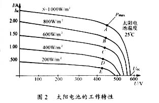 圖2為太陽電池的工作特性曲線圖。由圖可知,太陽電池的工作特性為一組非線性曲線,A、B、C、D、E點為不同日照下的最大輸出功率點,并且對應輸出最大功率點處的電壓值在不同日照下基本不變,根據這一特點,采用恒壓跟蹤方式,利用簡單的硬件電路基本上就可以實現太陽電池的輸出功率為最大;同時,由圖2又可知,當蓄電池過充時只要使太陽電池工作于開路狀態就可以實現過充保護。