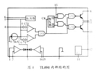 TL494是美國德州儀器公司的產品,其價格便宜,容易購得,并且在其內部同時解決了電流調節器、脈寬調制和最大電流限制,芯片內還設置了一些附加監控保護功能,使得芯片具有較強的抗干擾能力和較高的可靠性,用此芯片構成的控制系統外接元器件較少,結構簡單。圖4為該芯片的內部結構圖。