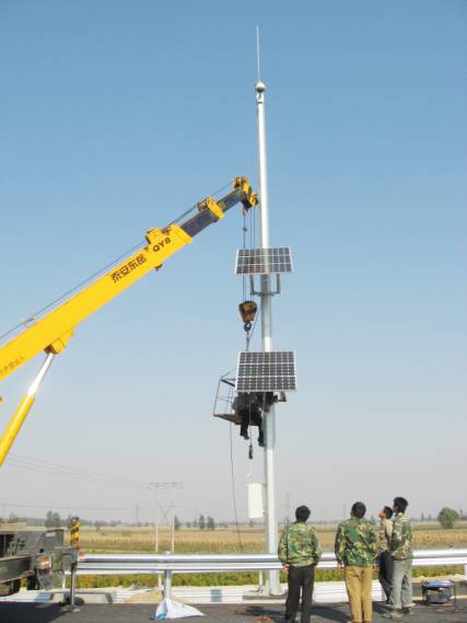 該系統由太陽能電池組件、太陽能控制器、蓄電池組構成。電池板安裝在高達5米的攝像機立柱上,蓄電池埋在地下用水泥封固,能有效地防止人為破壞,是解決高速公路遠程供電的較好方法。