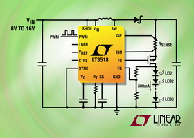 LT3518 可以用 12V 輸入驅動多達 10 個 350mA 白光 LED,而 LT3517 可以驅動 5 個,因此它們非常適用于多種應用,如汽車顯示屏背光照明。這兩款器件采用緊湊型 4mm x 4mm QFN 封裝,在升壓模式時具有高達 90% 的效率。它們利用 True Color PWMTM 調光實現恒定 LED 顏色,調光比高于 3000:1。就較低的調光需求而言,CTRL 引腳可以用來提供 10:1 的模擬調光。其固定頻率和電流模式架構在寬電源和輸出電壓范圍內實現穩定工作。頻率調節引腳使用戶能夠在 250kHz 至 2.5MHz 之間對頻率編程以優化效率,同時也最大限度地減小外部組件尺寸。