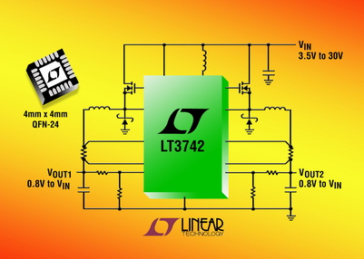 LT3742 采用 4mm x 4mm QFN-24 封裝。以 1,000 片為單位批量購買,每片價格為 2.30 美元。