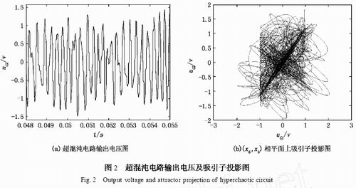 典型超混沌信號及相圖如圖2(a)、(b)所示,此時超混沌信號對應的李雅普諾夫指數為:λ1=0.042λ2=0.008,λ3=0.000,λ4=-0.067。用于計算機模擬中除圖中給出的超混沌信號外,對應的混沌和亞超混沌信號的李雅普諾夫指數分別為:λ1=0.029,λ2=0.000,λ3=-0.038,λ4=-0.097和λ1=0.033,λ2=0.000,λ3=0.000,λ4=-0.073。