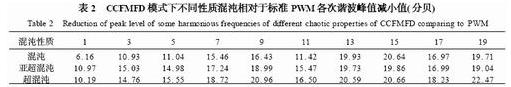 大量的計算機模擬表明,不論是使用混沌還是超混沌信號生成混沌開關調制信號,都可以降低Boost型變換器輸入電流的諧波譜峰值,但不同的混沌調制模式有不同的頻譜擴展結果。在相同輸出電壓條件下,以標準PWM模式為參考,將4種混沌調制模式進行橫向比較可以得到:諧波峰值平均降低量以CCFMFD模式為最大,CCFMVD模式次之,CPWM模式效果最差。這與文獻使用“蔡氏電路”雙渦卷混沌序列調制模式下對Buck型變換器進行計算機模擬所得結果一致。就同一種開關調制模式而言,不同性質混沌對CCFMFD模式的影響如表2所示。即在電路參數、輸出直流電壓、調制模式都相同的情況下,僅僅改變調制信號的性質得到的結果。