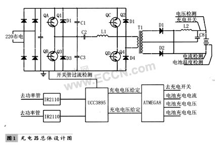充電對象為鎳氫電池,采用電壓,電流反饋的方法來達到恒流,恒壓充電的目的,同時對充電過程中的各種參數進行檢測和控制。該充電器的總體設計如圖1。