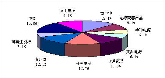對于電源企業經營范圍來講,此次調研為了真實體現各個子行業的實際情況,采取對子行業的平均抽樣調研方法。UPS和開關電源產品所占比例為15.8%和12.7%,略高與其他子行業的分布水平,主要因為這兩個子行業發展迅速,廠商眾多。