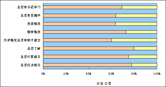 企業產學研整體情況調查包括是否打算建立產學研體系、對產學研運作是否了解、否有示范部門、產學研是否進入良性循環、產學研體系的完善情況、外部環境是否有助于建立產學研體系等。本次調查中,有80%的企業對產學研非常了解;企業有示范部門的占70%;已經能夠進入連性循環的占了63%。調查中發現,企業規模越大,經歷效益越好,其產學研體系就越完善。反之,小企業對產學研結合有點“渴望而不可及”。